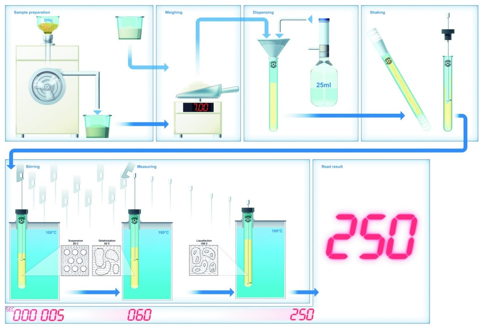 Регулируемый скоростной вискозиметр с возможностью нагрева и охлаждения может быть использован для оценки желатинирующих характеристик крахмала и других крахмалосодержащих ингредиентов и степени термической обработки смешанных составов и экструдированной готовой продукции. Крахмал влияет на текстуру, вкус, цвет, питательную ценность и стабильность срока годности закусочных пищевых продуктов.